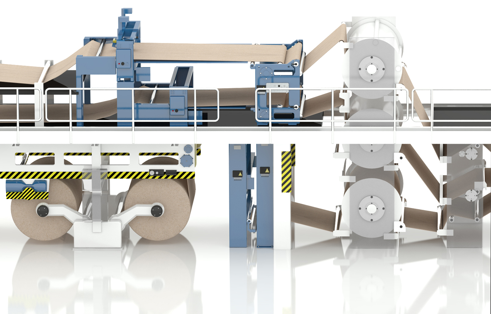 Modeling and visualisation of an automated corrugated cardboard production machine.